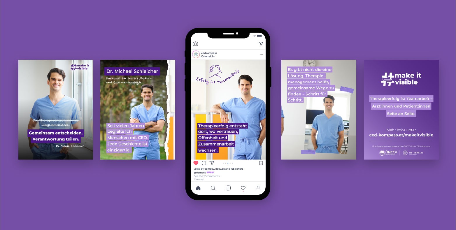 #makeitvisible is a multi-channel campaign that aims to raise visibility and understanding of inflammatory bowel diseases such as Crohn’s disease and colitis ulcerosa. The campaign was conceived to challenge stereotypes, humanise lived experience, and create space for honest conversations, while integrating both patient perspectives and professional insight.
