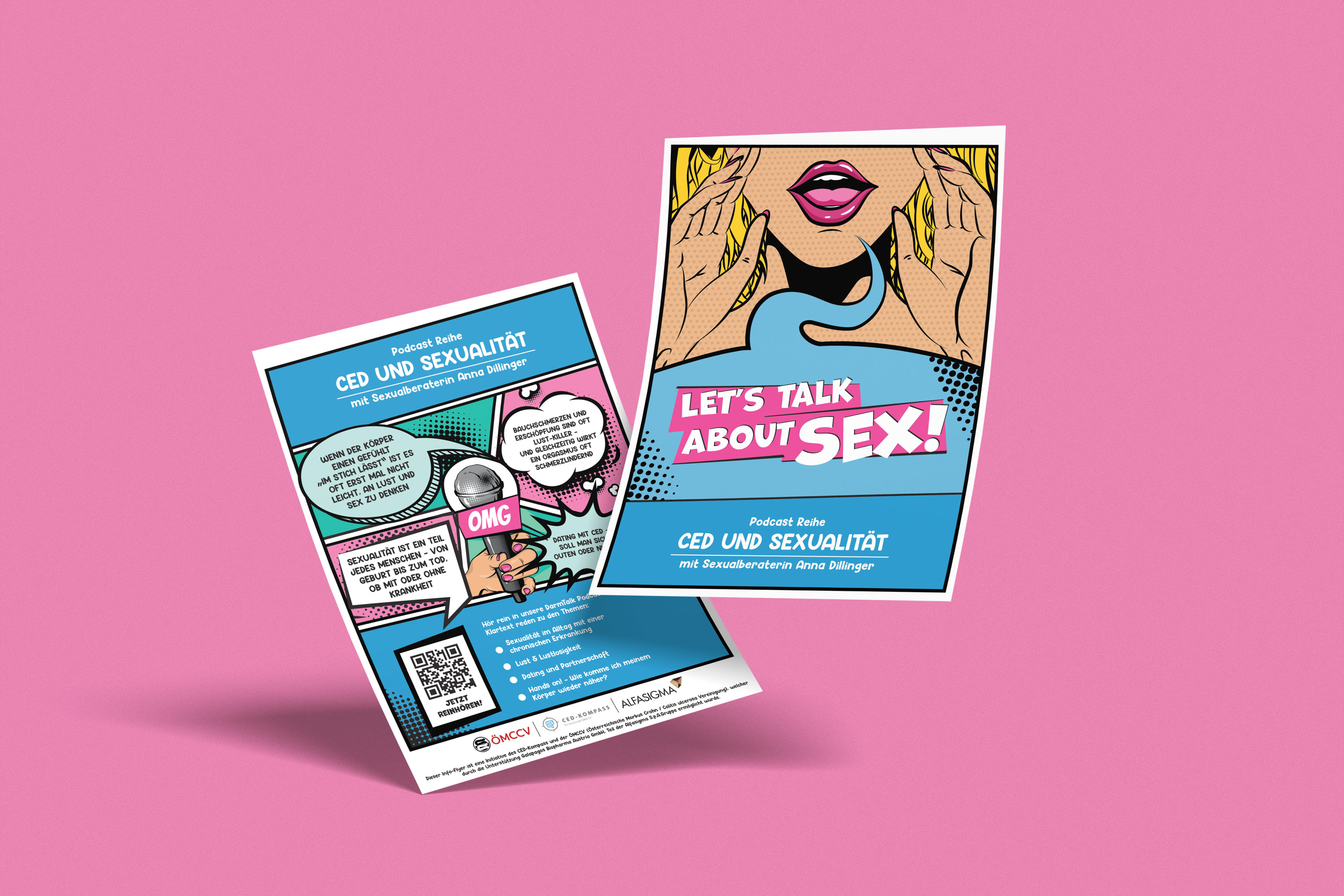 This flyer was created to promote the podcast 'CED und Sexualität', which explores sexuality from the perspective of people living with IBDs. The brief called for a bright, pop art inspired design that approaches a sensitive topic in a playful and approachable way. The design uses colour, illustration, and clear messaging to spark interest and encourage engagement with a topic that is often considered taboo.